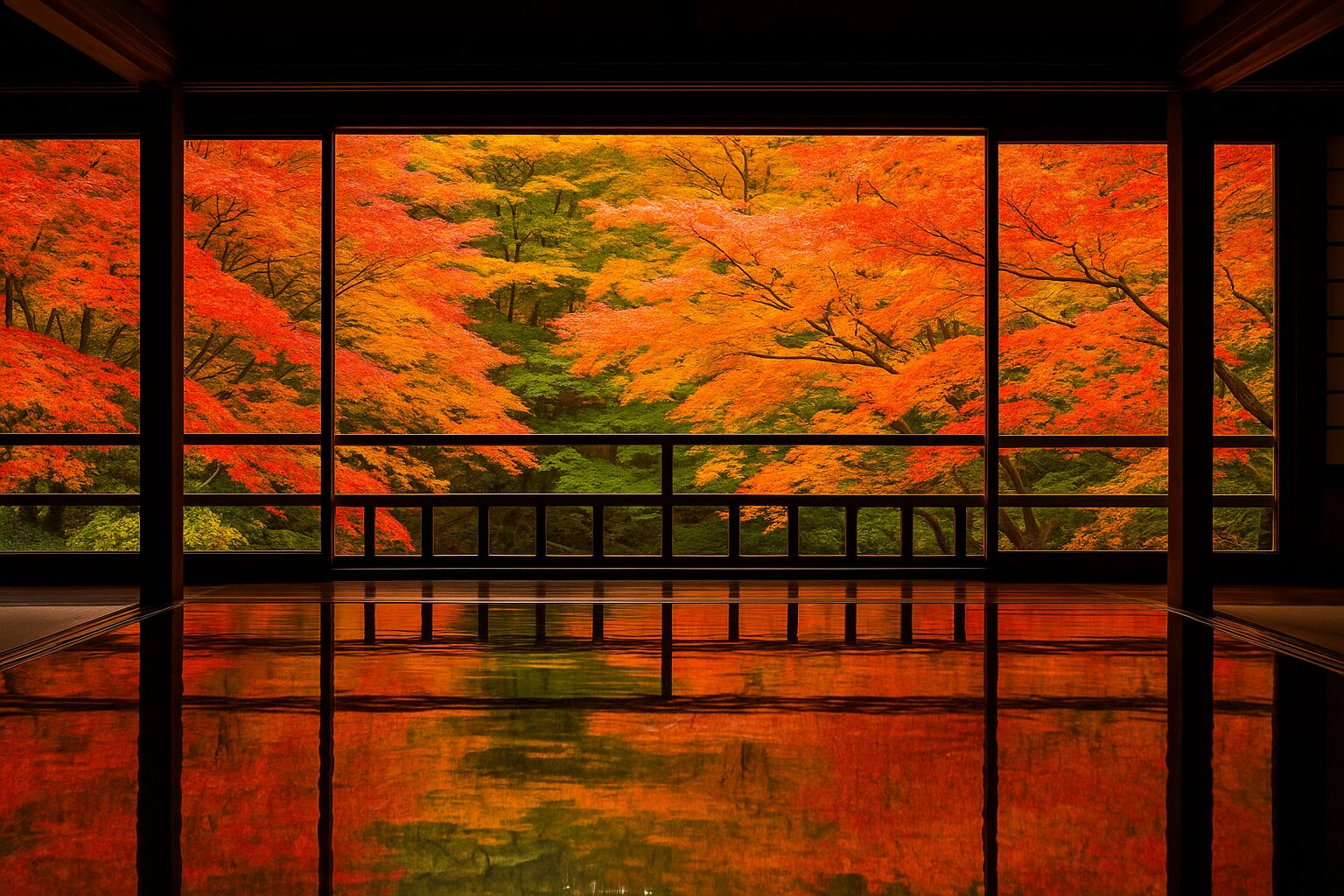 撮影する際は、なるべく床に対して斜め45度の角度から撮ると、奥行きと紅葉のグラデーションが表現しやすくなります。また、カメラのホワイトバランスを「曇天」モードに設定することで、紅葉の赤がより深みのある色に仕上がります。スマホでも十分綺麗に撮影できますが、広角レンズを使うと床全面に映る紅葉をしっかり収めることができるでしょう。