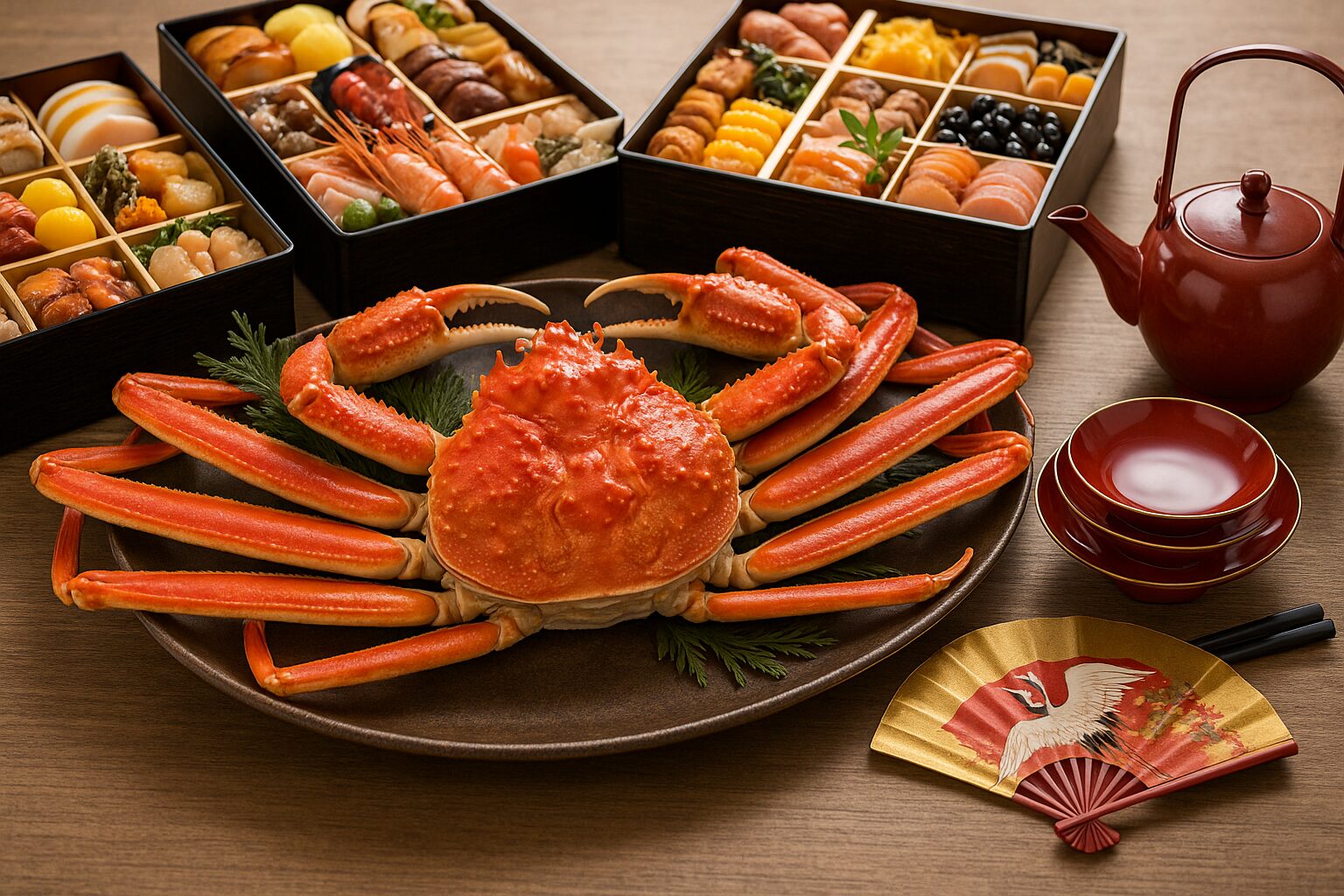 おせちの中にも伊勢海老やあわび、ロブスター、蟹甲羅焼きなどの海鮮メニューが入っているものがあり、カニと合わせると“海の幸尽くし”のお祝い料理になります。一方で、ローストビーフや洋風オードブル、中華風メニューが入った重を選べば、おせち+カニ+肉料理で、子どもから大人まで楽しめるバランスのいい食卓に。